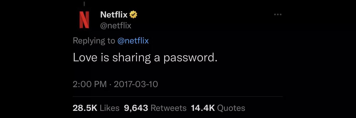 Happy Thursday. Have you been kicked off of your girlfriend’s brother’s ex-roommate’s Netflix account yet? It looks like the streaming service’s crackdown on password sharing is (unfortunately) actually working. Pour one out for Netflix’s bygone “the more the merrier” era, it seems there’s no going back now.